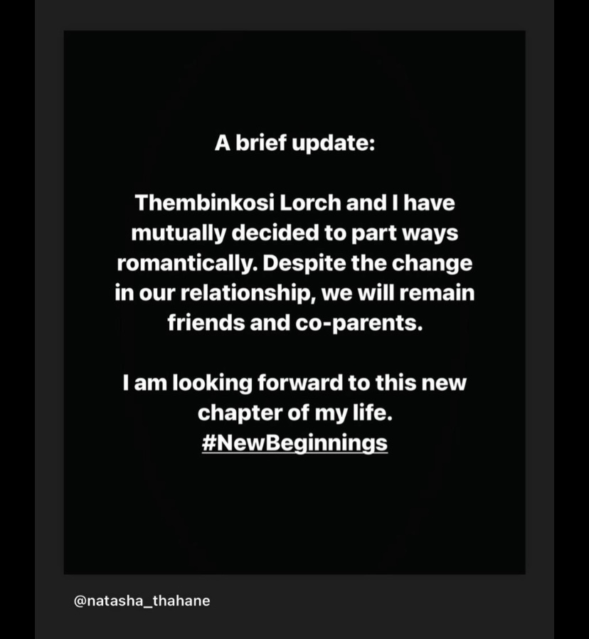 Actress Natasha Thahane and her boyfriend/rumoured fiancé Thembinkosi Lorch have broken up. Natasha took to social media to share a brief stateent announcing their breakup and confirming that the two share a child together.