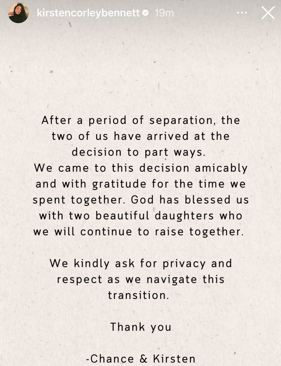 No specific reason has been stated as the cause of the divorce apart from it being “amicable”. However, social media users have reacted to the news with speculations that Chance may have been unfaithful.
