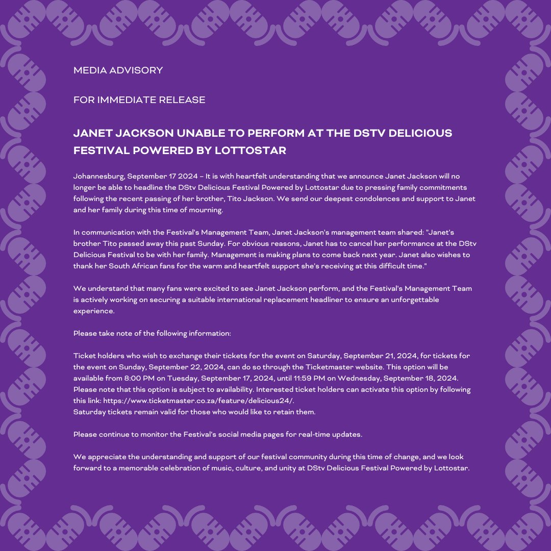 It is with heartfelt understanding that we announce Janet Jackson will no longer be able to headline the DStv Delicious Festival Powered by Lottostar due to pressing family commitments following the recent passing of her brother, Tito Jackson. We send our deepest condolences and support to Janet and her family during this time of mourning.