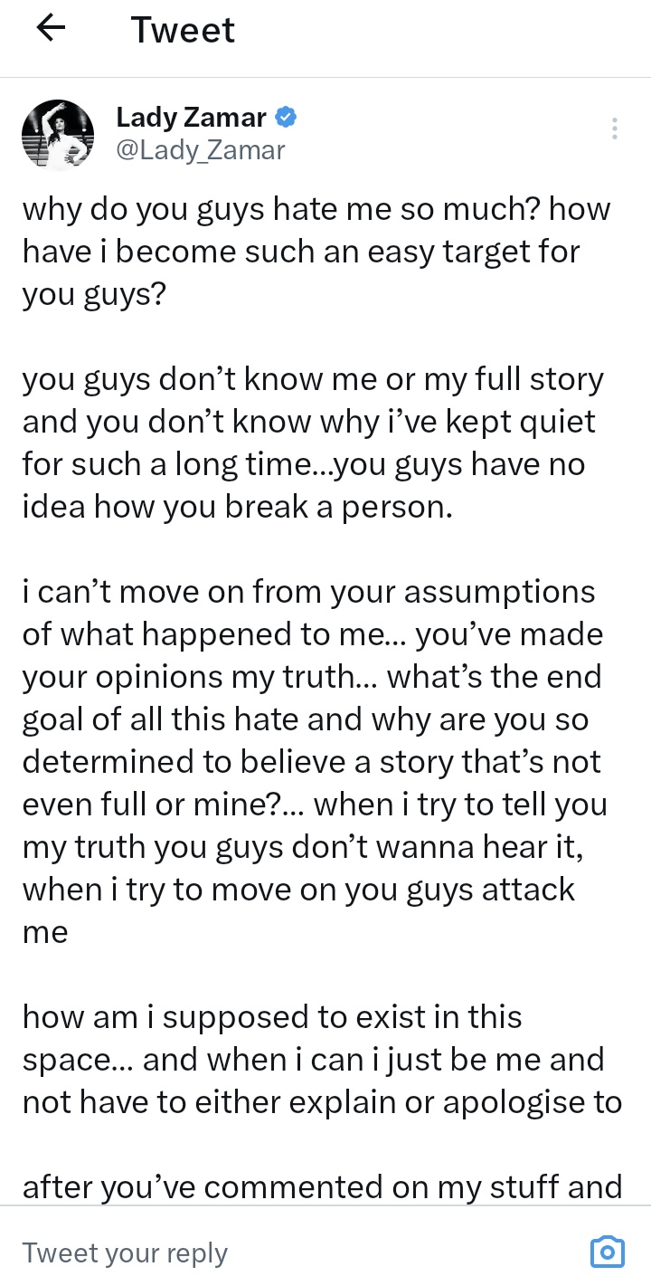 “You guys don’t know me or my full story and you don’t know why I’ve kept quiet for such a long time…you guys have no idea how you break a person.” Said Lady Zamar in her recent Tweet.