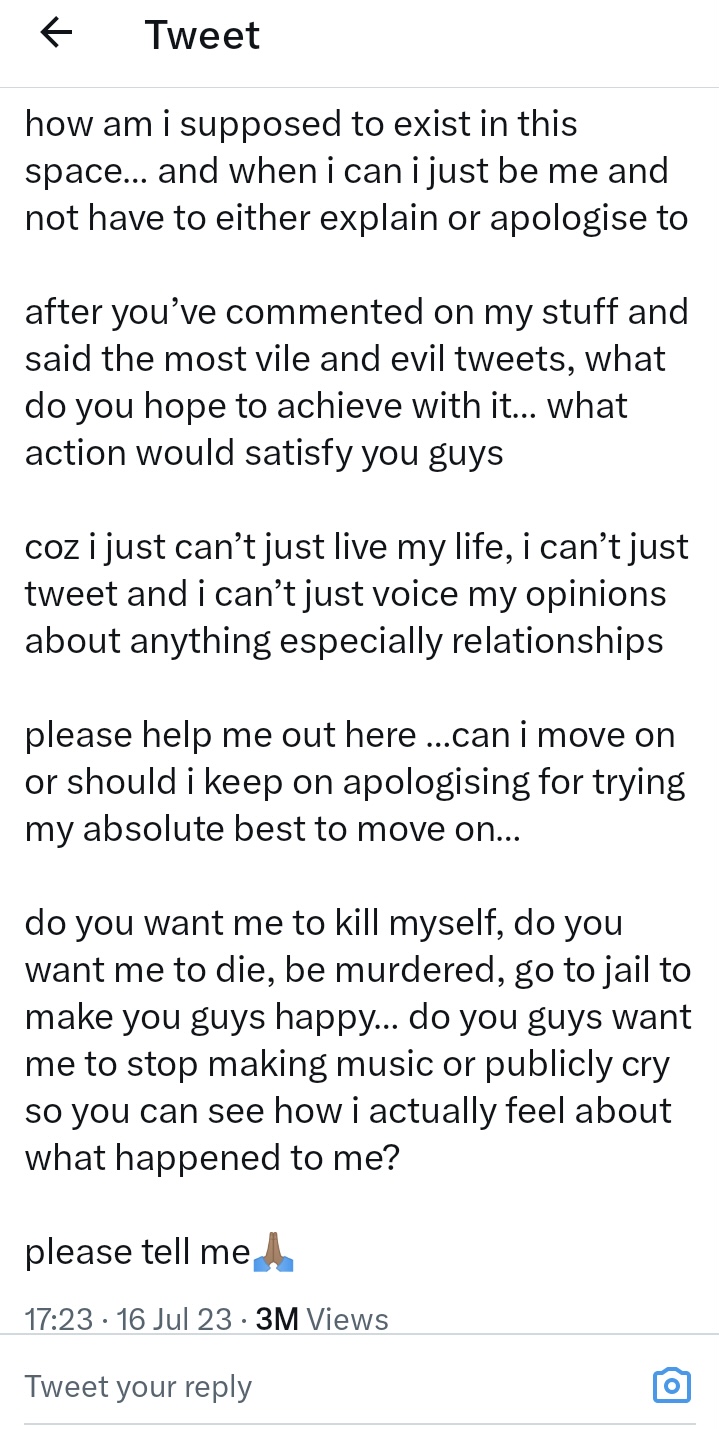 “Do you want me to kill myself, do you want me to die, be murdered, go to jail to make you guys happy…do you guys want me to stop making music or publicly cry so that you can see how I actually feel about what happened to me? Please tell me.”