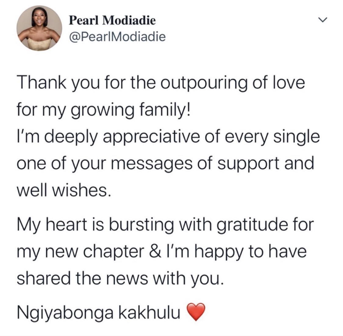Congratulations are in order for radio host and TV presenter Pearl Modiadie. The lovely media personality took to social media to share that she has indeed given birth to her first child.