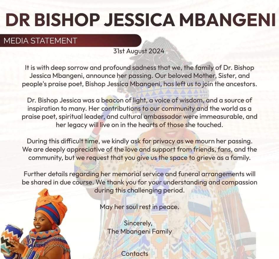 It is with deep sorrow and profound sadness that we, the family of Dr. Bishop Jessica Mbangeni, announce her passing. Our beloved Mother, Sister, and people’s praise poet, Bishop Jessica Mbangeni, has left us to join the ancestors.