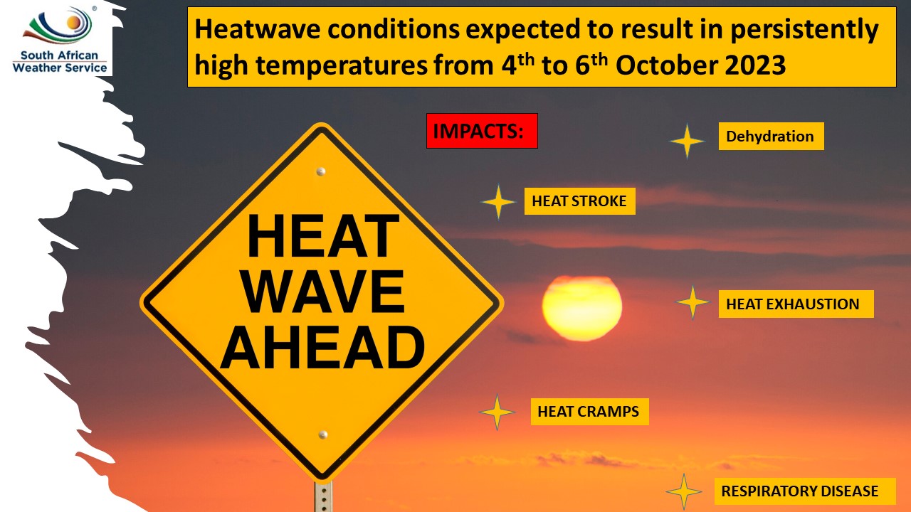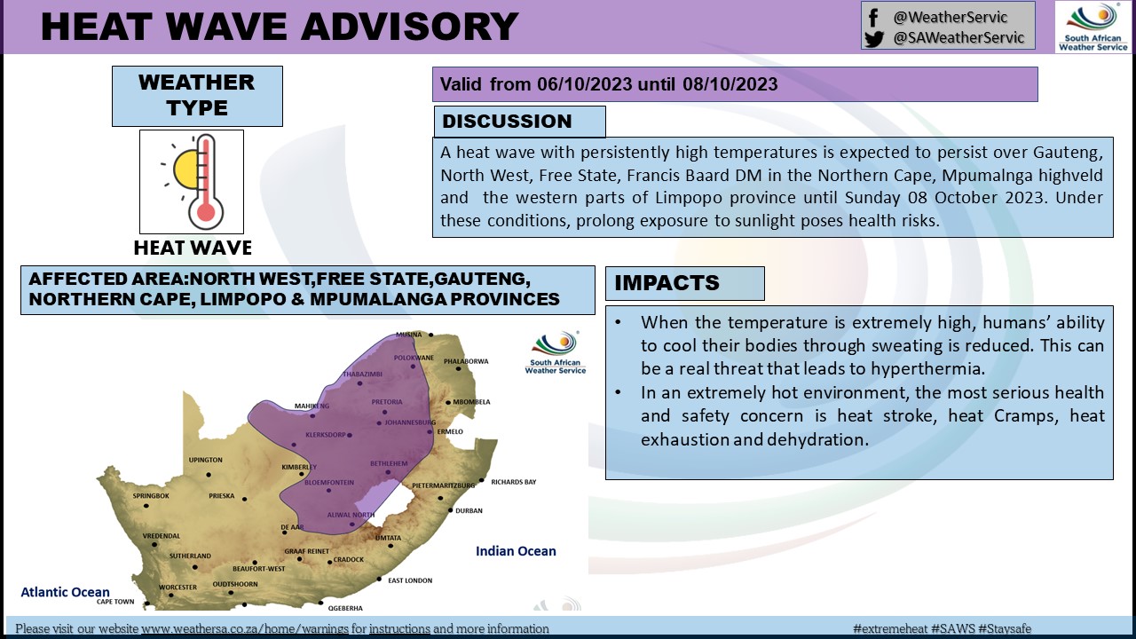 “A heat wave with persistently high temperatures is expected to persist over Gauteng, North West, Free State, Francis Baard DM in the Northern Cape, Mpumalanga highveld and the Western parts of Limpopo province until Sunday 08 October 2023.”, says SA Weather in a statement.