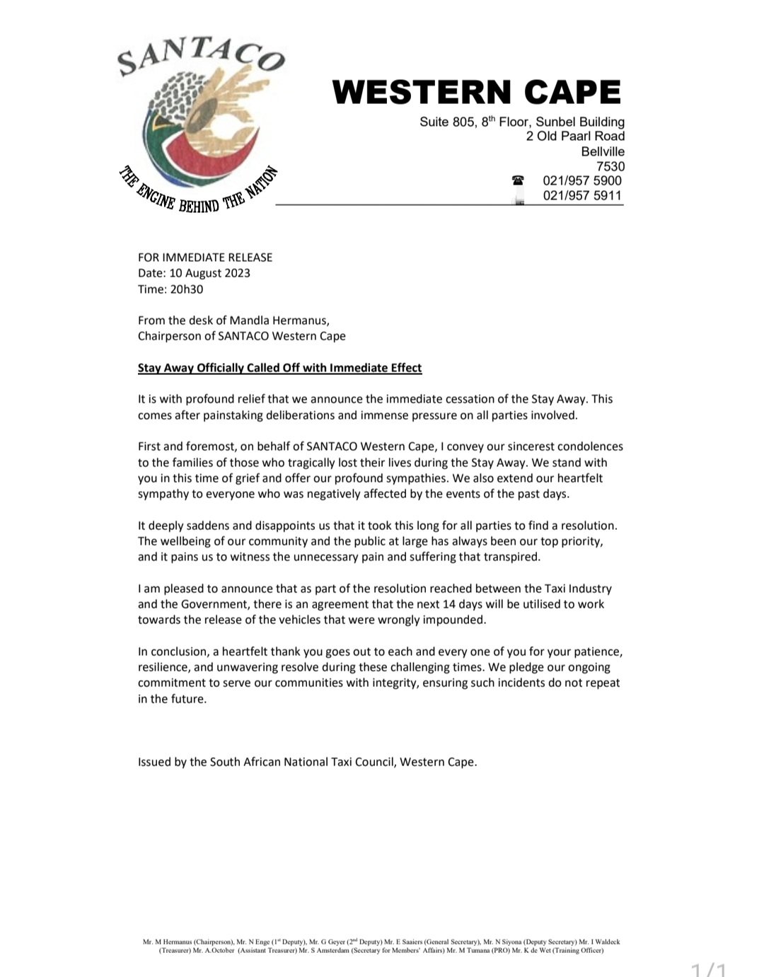 Western Cape residents can breathe a sigh of relief, as the South African National Taxi Council (SANTACO) released a press statement on Thursday evening 10 August 2023, calling off the taxi strike in Western Capewith immediate effect.