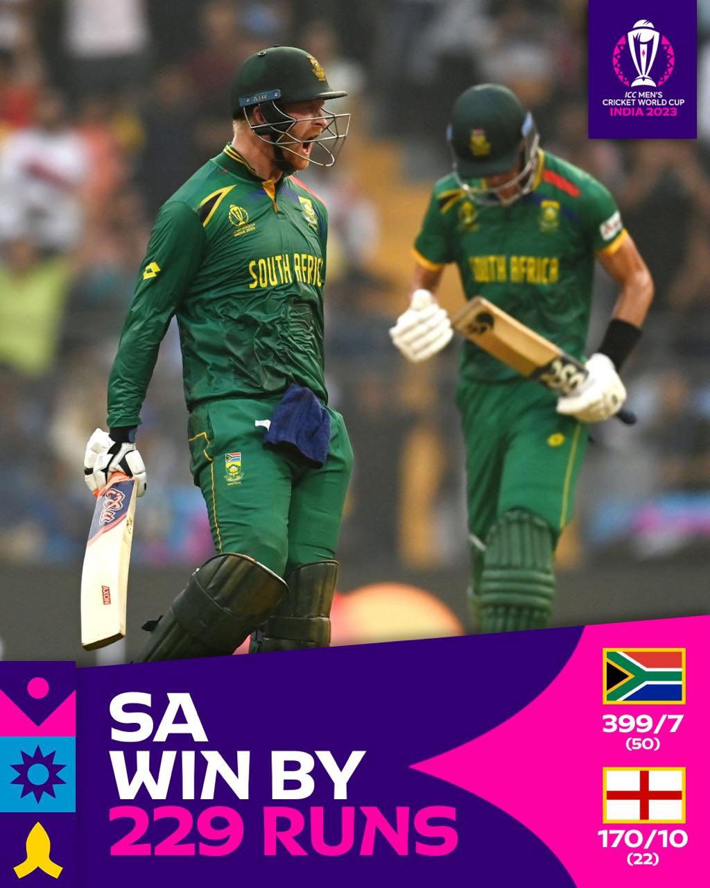South Africa’s national cricket and rugby teams, the Proteas and Springboks, respectively, secured victories over England on Saturday, 21 October 2023. The Proteas defeated England by a record-breaking 229 runs in their Cricket World Cup match held at Wankhede Stadium in Mumbai. Meanwhile, the Springboks beat England 16-15 in the semi-finals of the Rugby World Cup.
