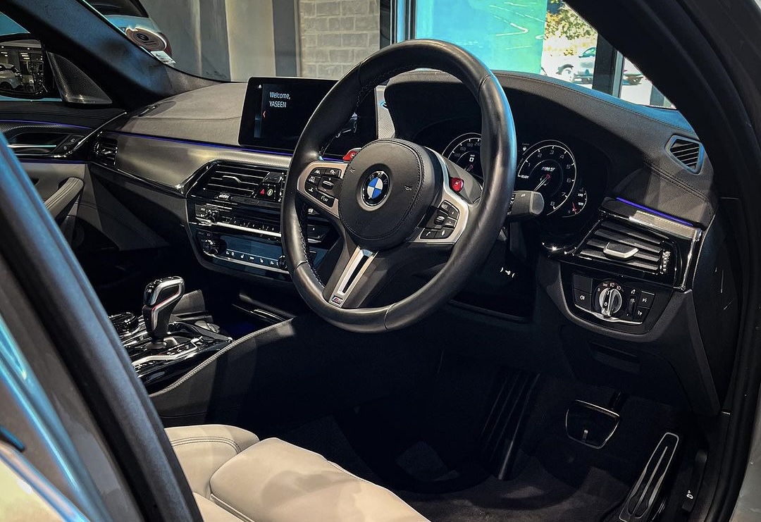 The exterior design is very menacing, angled, and sportier over the standard 5-series. It has bigger air intakes at the bottom of the grille feeding air into that engine. It has the signature BMW eyes with LED technology that can block certain parts of the road and illuminate signs and obstacles at night. It also gets bigger brakes and wheels adding to the aggressive side profile. Sitting lower and wider than the standard versions. The rear is a sight most cars will be seeing once it gets past them. The design of the lower parts is unique to the M5, with the diffuser surrounding the quad exhaust tips.