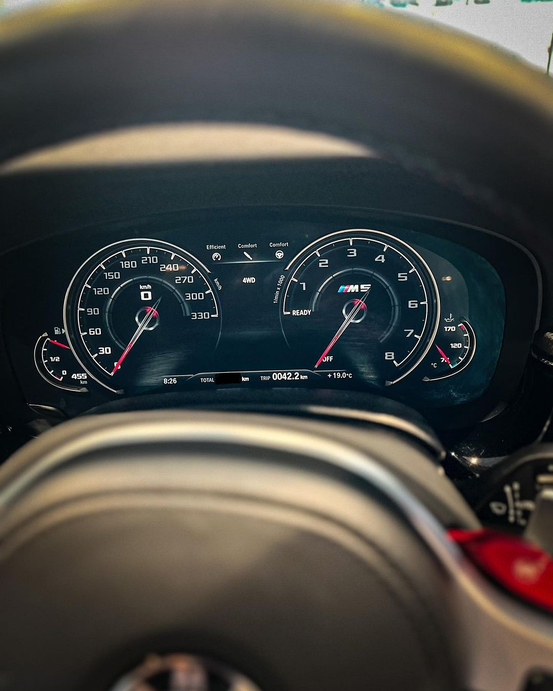 Without moving to the more expensive and powerful M5 Competition Pack. The standard M5 has the same 4.4 litre twin turbo V8 making 25 horsepower less than the Competition Pack at 600 horsepower and the same 750 Nm of torque. Routed through an eight-speed torque convertor automatic transmission, sending all that power to an M XDrive system. More interestingly is the all-wheel drive system, that can decouple the front drive train essentially making it a rear wheel drive, 600 horsepower slide machines. We first saw this technology in the Mercedes-AMG E63S, its competitor. The performance is available and with the non-competition pack version, the ride comfort is better whether in comfort or sports plus.