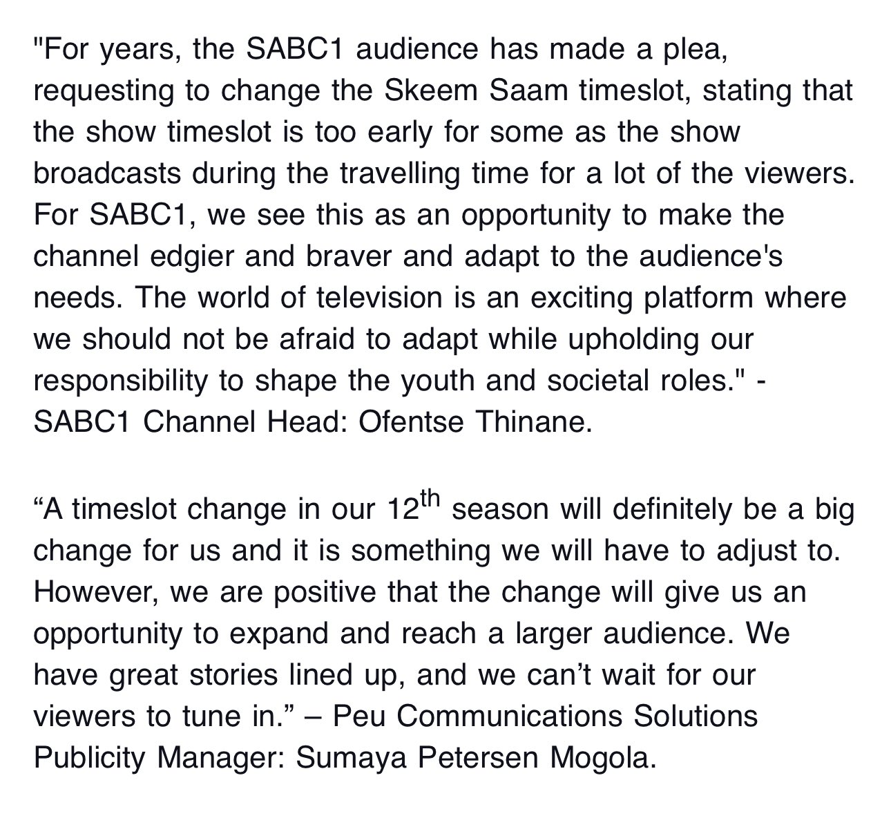 “For years, the SABC 1 audience has made a plea, requesting to change the Skeem Saam time slot, stating that the show’s time slot is too early for some as the show broadcasts during the travelling time for a lot of the viewers,” said SABC 1 channel head Ofentse Thinane in a press release.