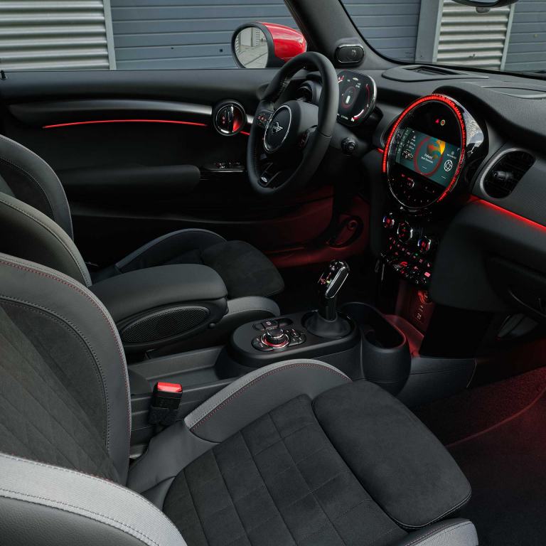 When you step inside the cabin of the car, you are met with ambient lights that set the mood inside the cabin. For instance, if you switch the car into sports mode, the ambient lights will change into a red colour, and the ambient lights will also function as a rev count. The interior of the car has John Cooper Works sports seats with various leather colour and tone options.